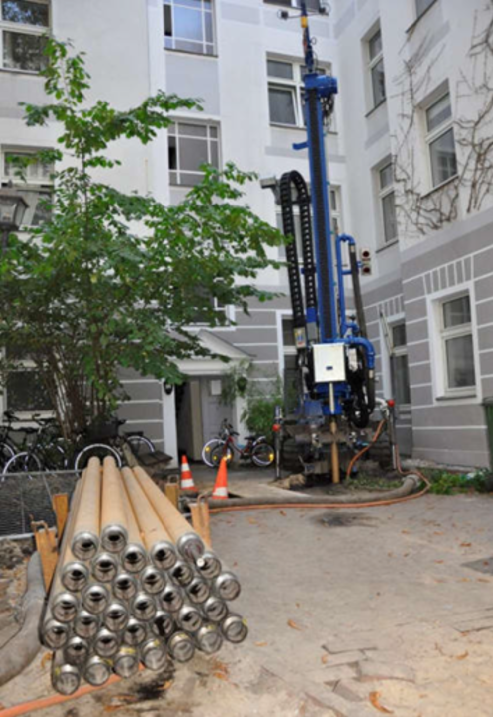 Im Fokus stand ein Wohngebäude in Berlin-Schöneberg mit 30 Wohneinheiten und rund 2.300 m² beheizter Fläche. Die Wohnungseigentümergemeinschaft (WEG) entschied sich dafür, einen Großteil des bisherigen Erdgasverbrauchs durch Erdwärme zu ersetzen. Hierfür wurden im Innenhof sechs Erdwärmesonden installiert, die über eine Wärmepumpe die Gasheizung unterstützen.