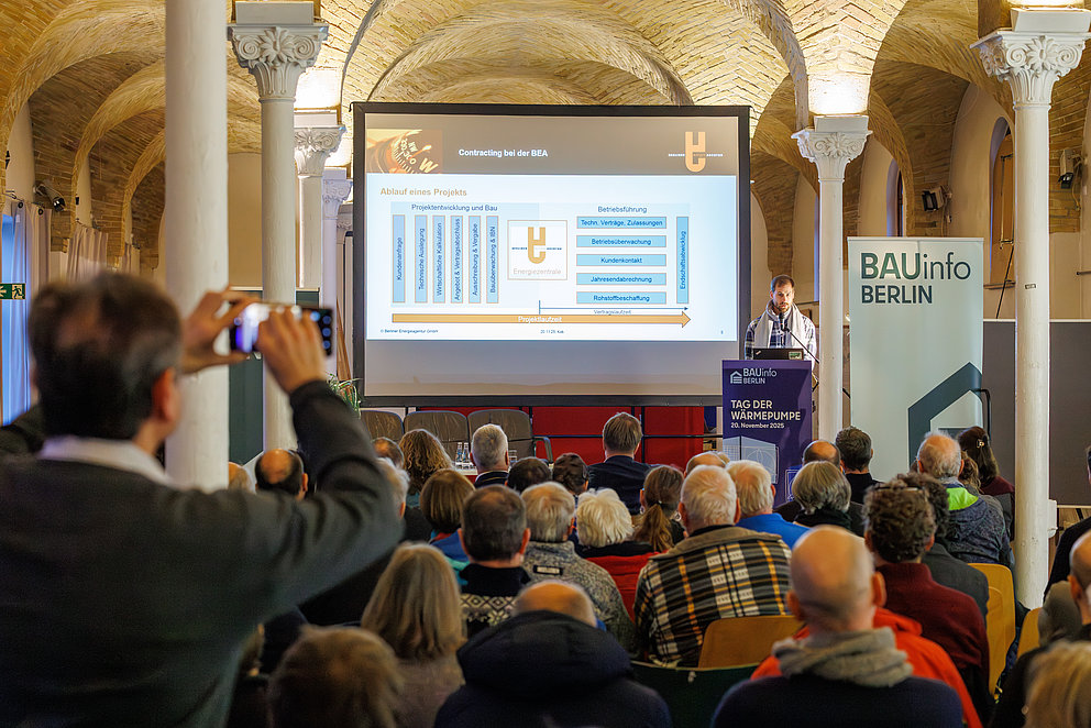 Mit hoher Beteiligung fand am 20. November 2025 die Hauptveranstaltung der Berliner Thementage der Wärmepumpe statt. Das BAUinfo Berlin bot in der halbtägigen Informations- und Netzwerkveranstaltung den Rahmen für Impulspräsentationen und Diskussionen rund um die Rolle der Wärmepumpe in Berlin. Begleitend wurden verschiedene technische Lösungen sowie Hilfestellungen für die Organisation gemeinsamer Projekte und Hausgemeinschaften beim Umstieg auf strombasierte Heizsysteme vorgestellt. Besonders erfreulich: Das Interesse war sehr hoch. Viele Eigentümer:innen – darunter einige Vertreter:innen aus Wohnungseigentümergemeinschaften (WEGs) – sowie Fachleute und Bürger:innen aus Berlin nutzten die Gelegenheit zur Information und zum Austausch.
