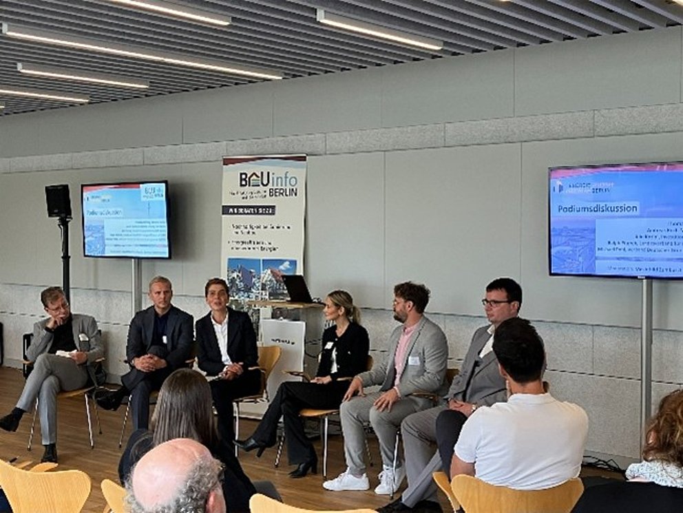 Die anschließende Podiumsdiskussion bot zusätzliche Einblicke in die Energiebranche. Moderiert von Mechthild Zumbusch der Berliner Energieagentur GmbH fand ein reger Austausch zwischen Publikum und den Gästen, der Landesverband für Energieberatung, des BAUinfo Berlin, der IBB Berlin, dem SHK-Handwerk und dem Verband Deutscher Grundstücksnutzer, statt.